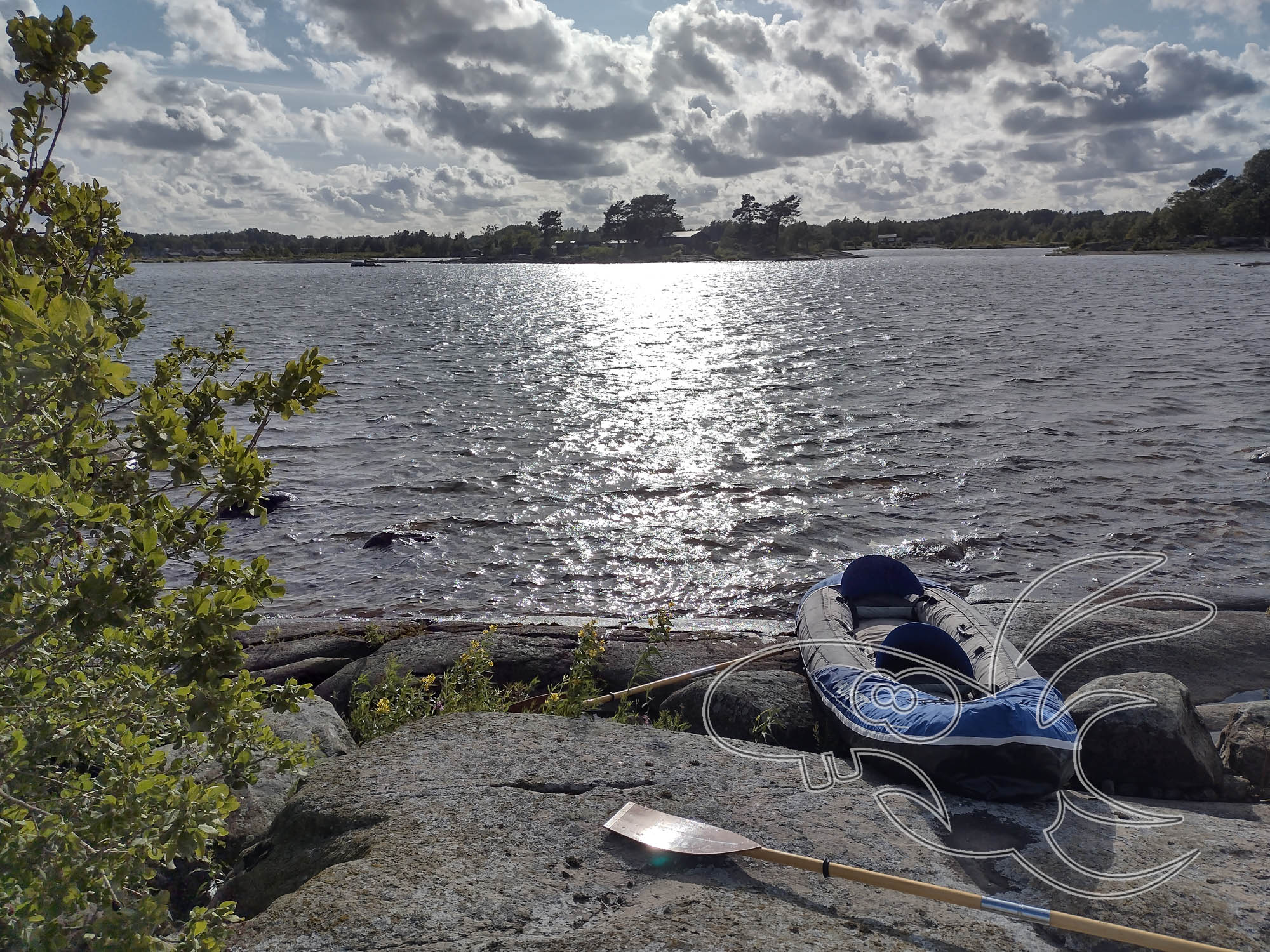 Der ufernahe Bereich des Vänern ist hier wunderschön, mit viele kleinen Inseln. Hier laden wir unser Sevilor Kayak aus und unternehmen die einzige, kurze Fahrt dieses Urlaubs damit im Bereich um den Hafen. Mehr Möglichkeiten ergaben sich auf Grund der ausgefallenen Unterkunft nicht.