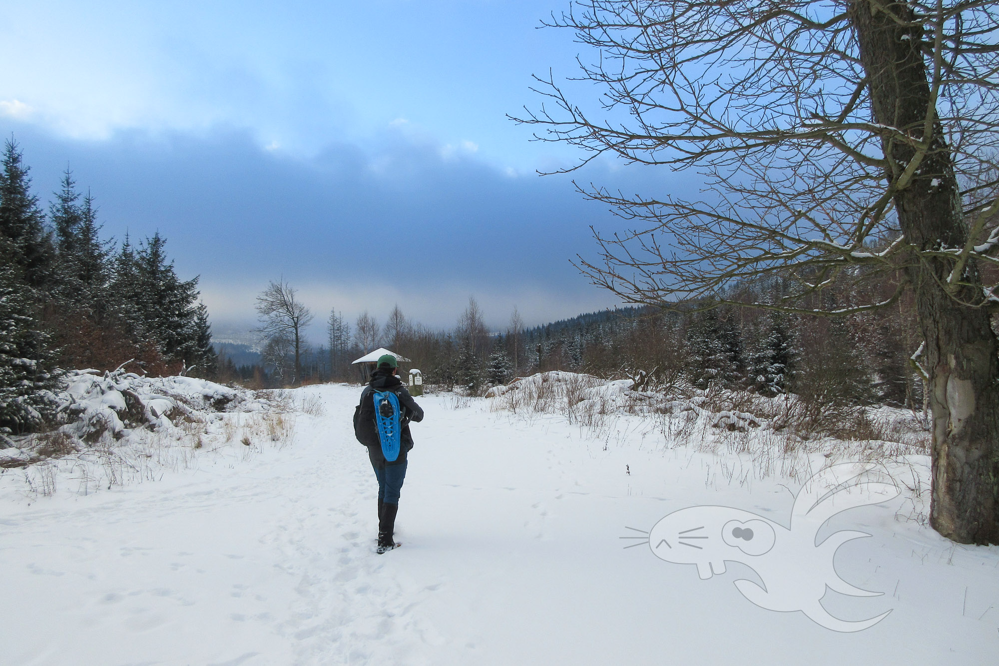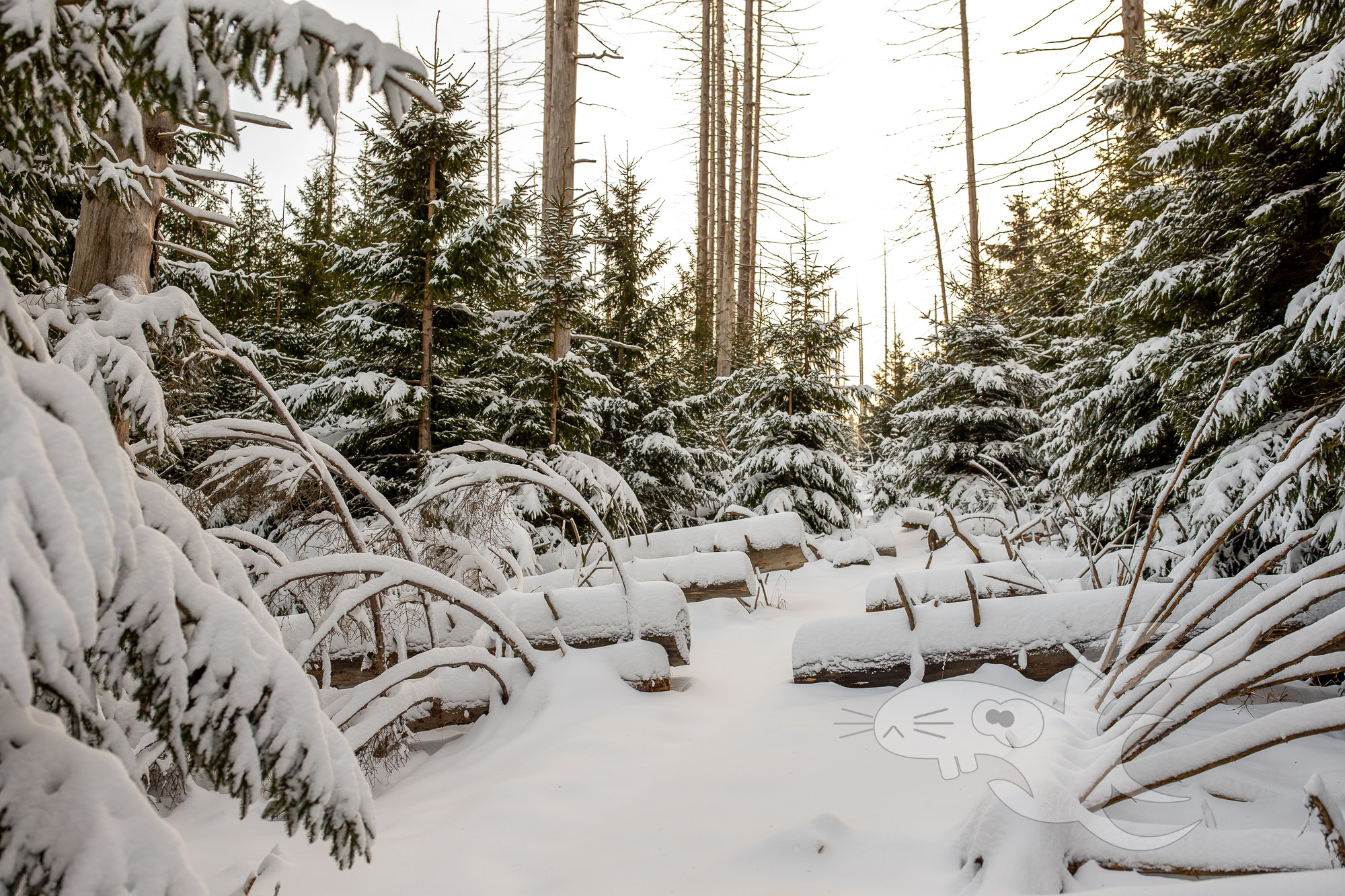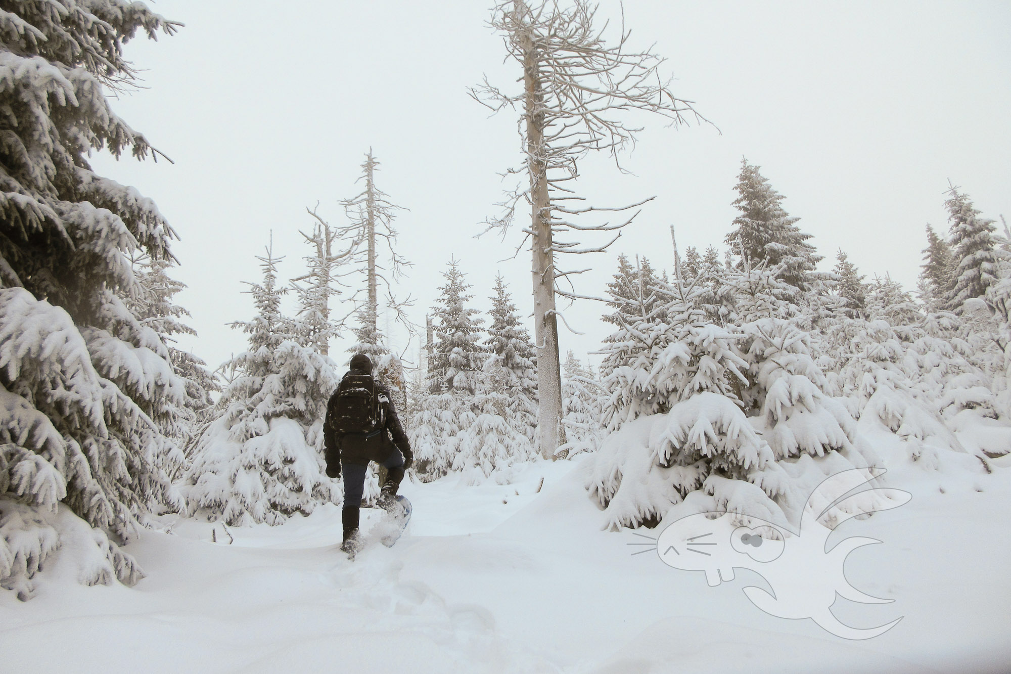 Wir haben hier also mit einem steil aufwärts gehendem "Weg" zu tun. Mit liegenden Bäumen, die alle paar Meter mit Schneeschuhen überwunden werden müssen. Ach ja, Schneeschuhe, da bis zu 30cm tiefer Schnee liegt. Und gelegentlich gibt es auch mal ein "schöne" Schneedusche von den jungen Fichten.