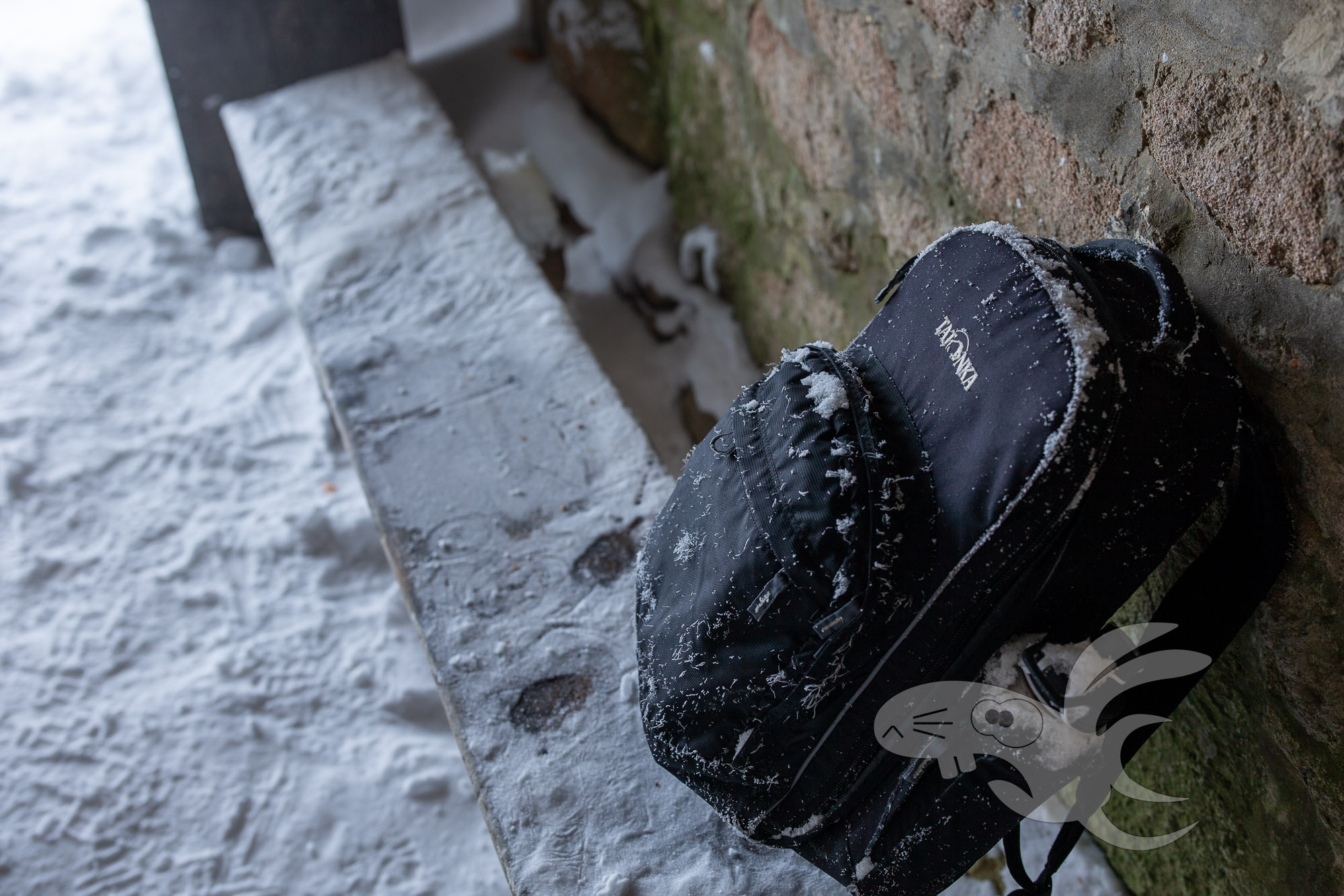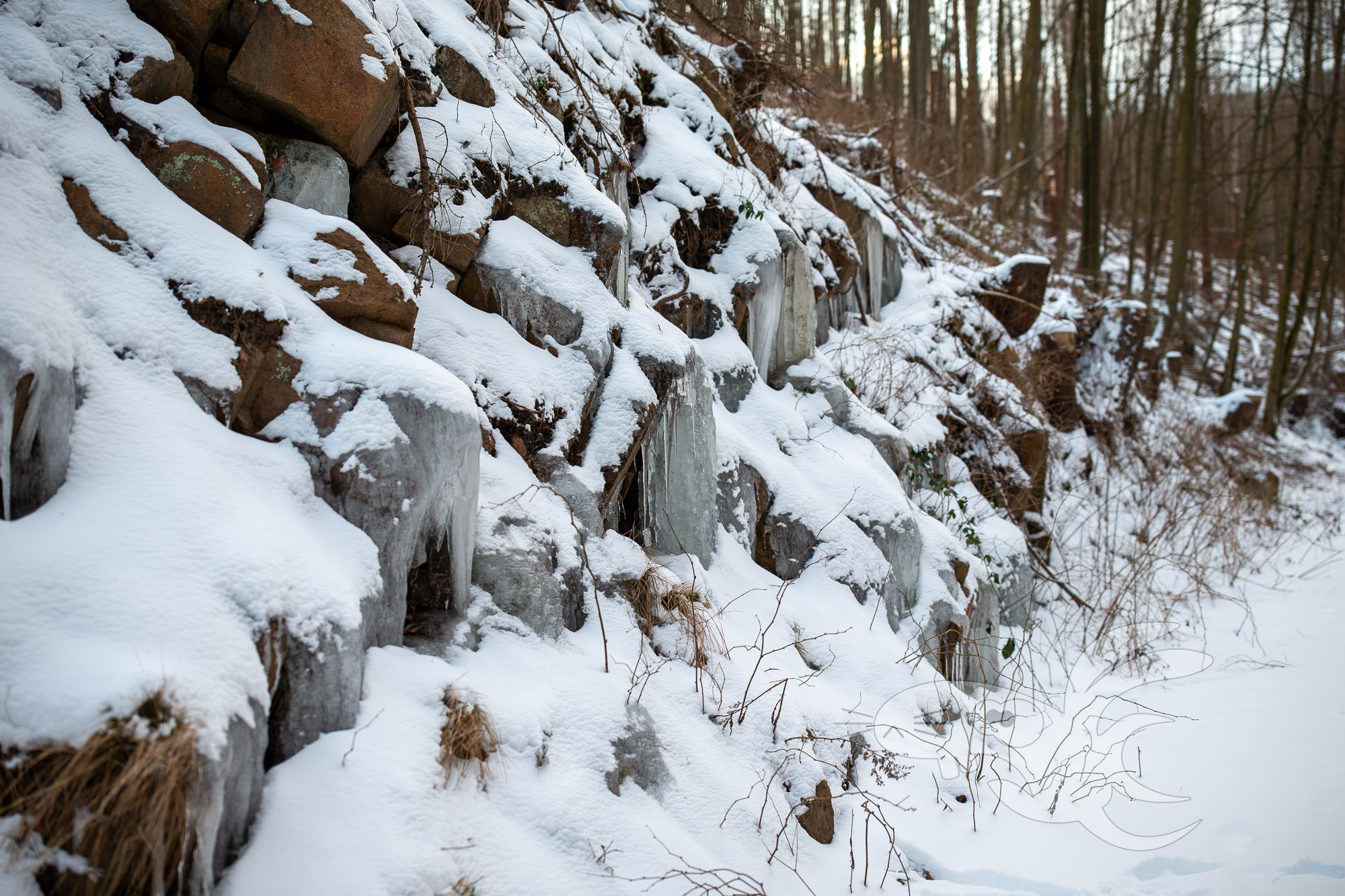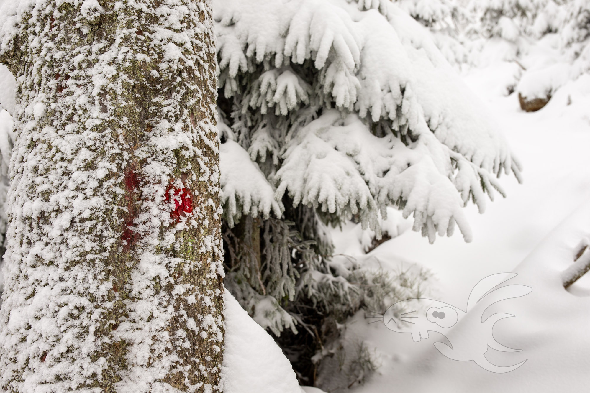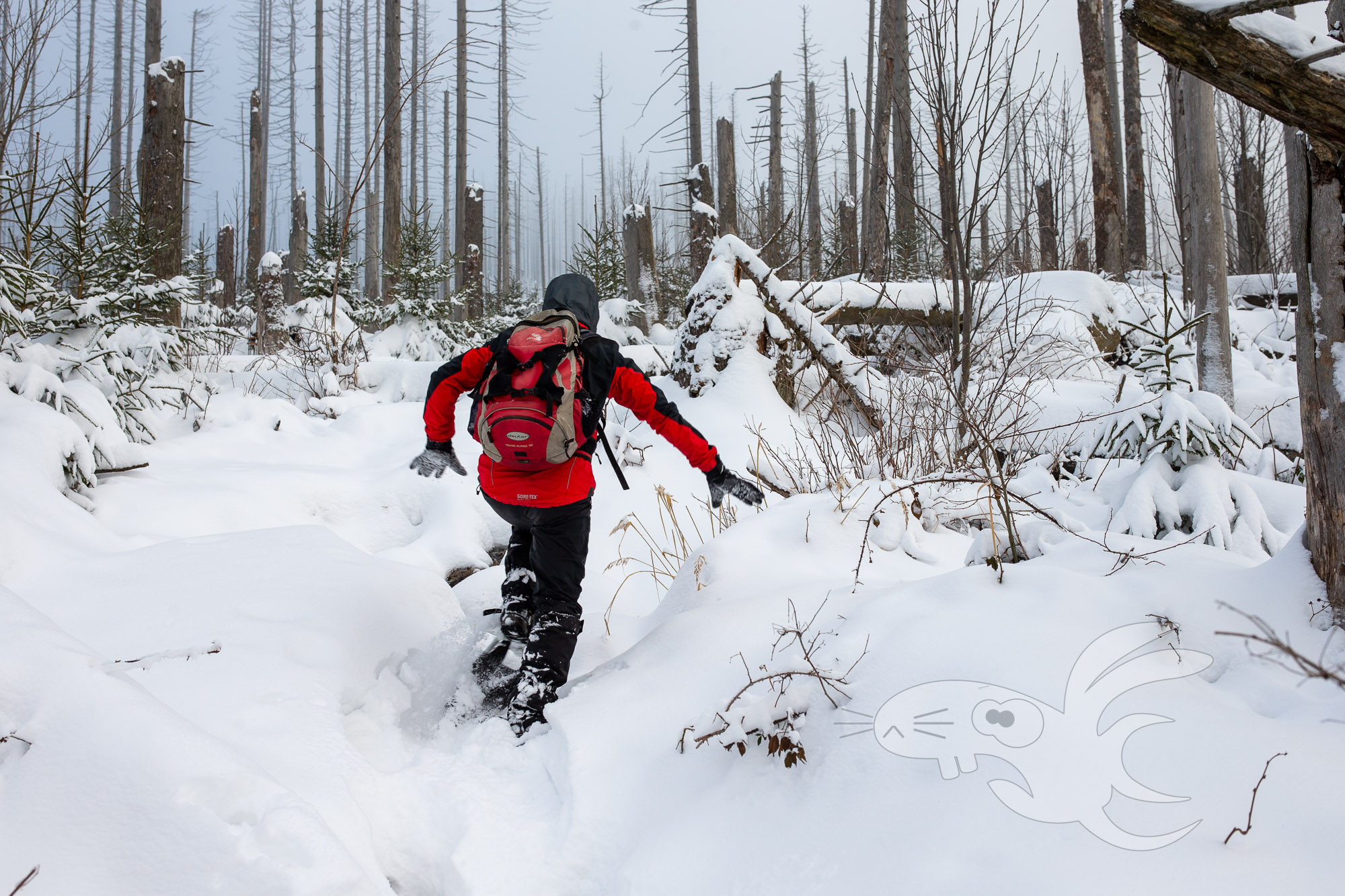 Wir haben hier also mit einem steil aufwärts gehendem "Weg" zu tun. Mit liegenden Bäumen, die alle paar Meter mit Schneeschuhen überwunden werden müssen. Ach ja, Schneeschuhe, da bis zu 30cm tiefer Schnee liegt. Und gelegentlich gibt es auch mal ein "schöne" Schneedusche von den jungen Fichten.