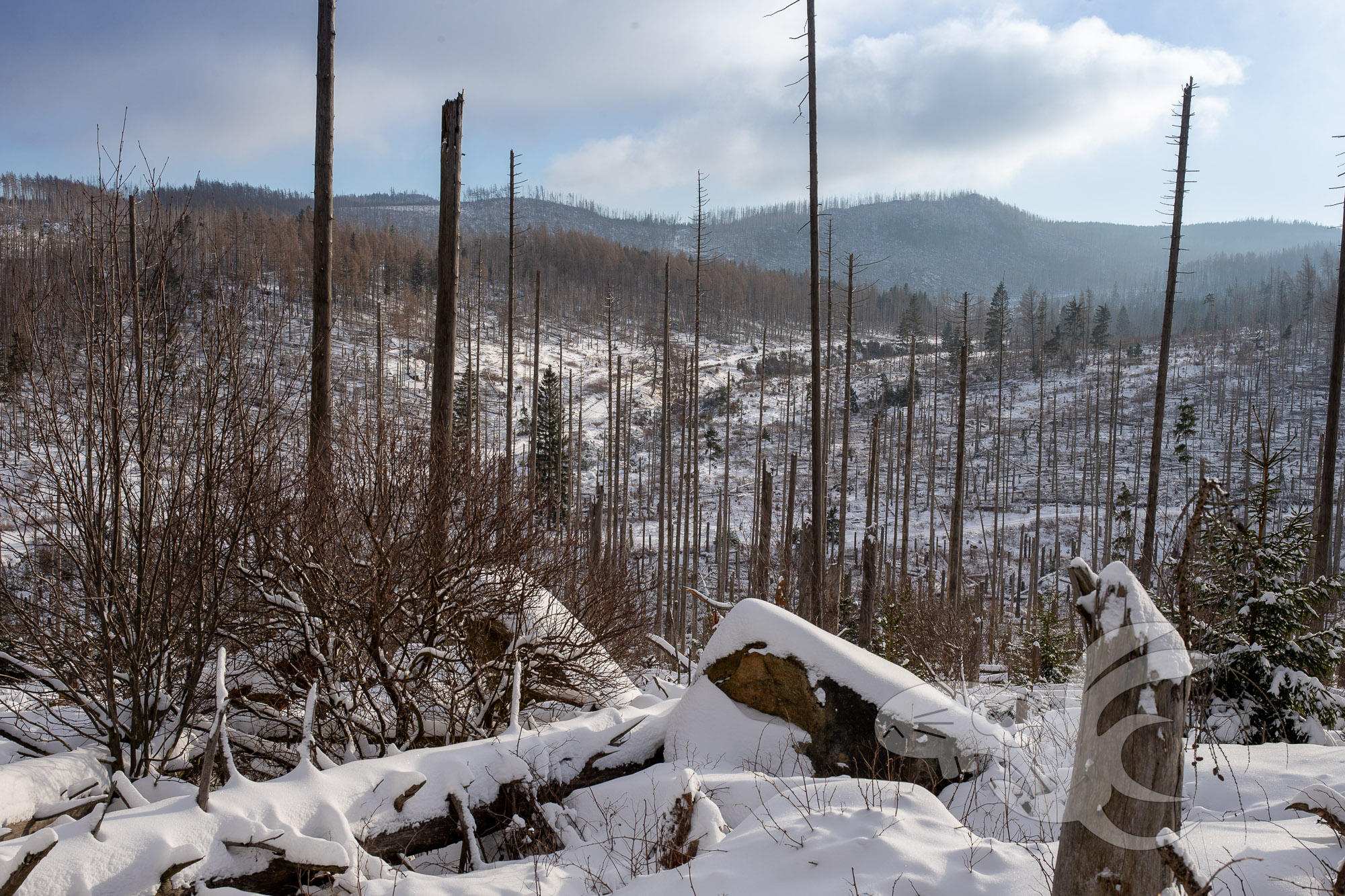 Abgesehen vom tollen Blick sieht man selbst jetzt im Winter, wie sich die Natur im Schutz der Totbäume mit aller Kraft entwickelt.