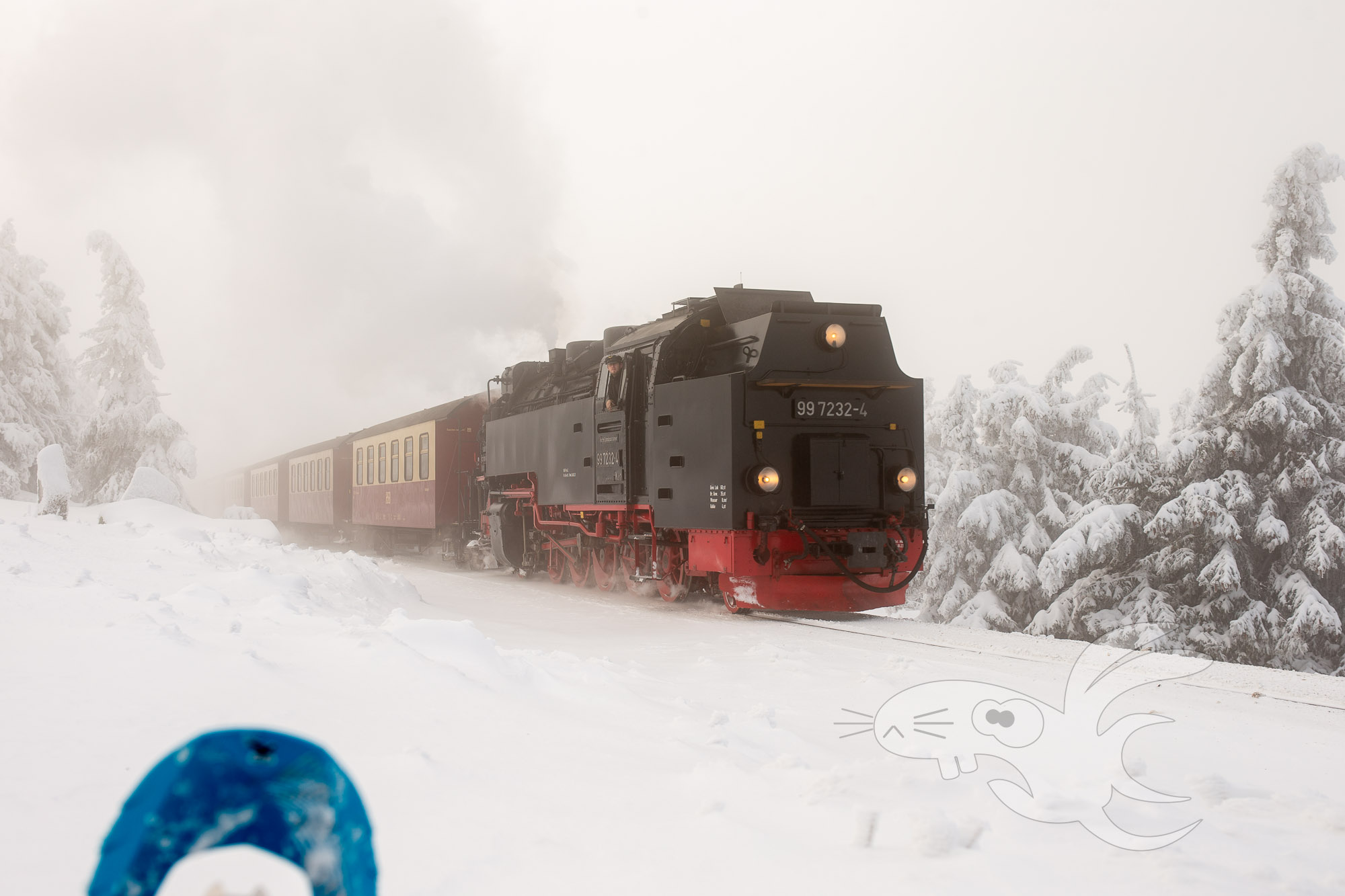 Unser Weg wird in seinem ursprünglichen Verlauf von der Trasse der Brockenbahn unterbrochen. Diese taucht überraschend aus dem Nebel auf.
