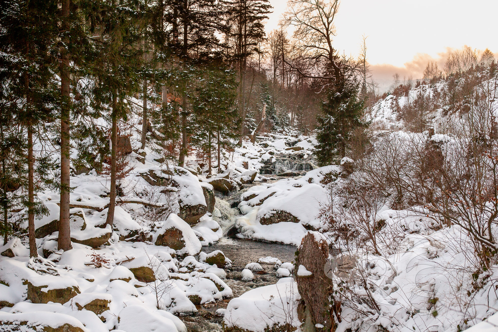 Es ist schön frisch, knapp unter Null Grad, hier auf Starthöhe. Die liegt bei 290 m Höhe über Meer. Hier im Ilsetal liegt genug Schnee, dass es sich wie ein ordentlicher Winter anfühlt.